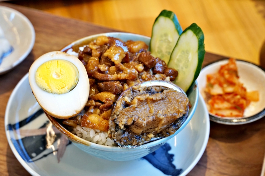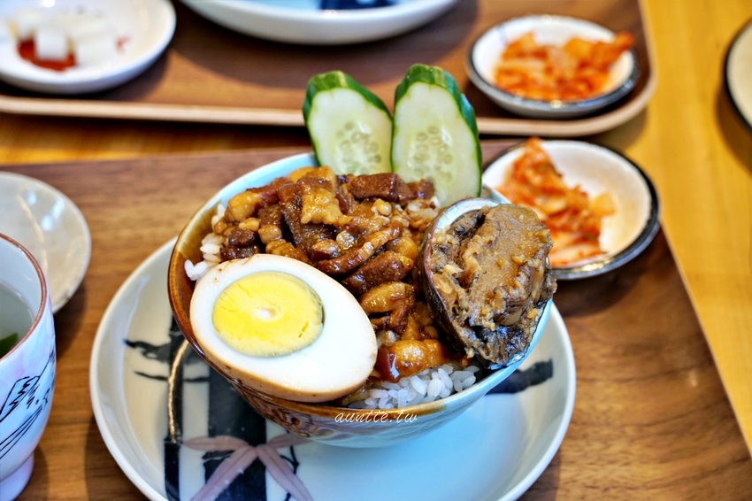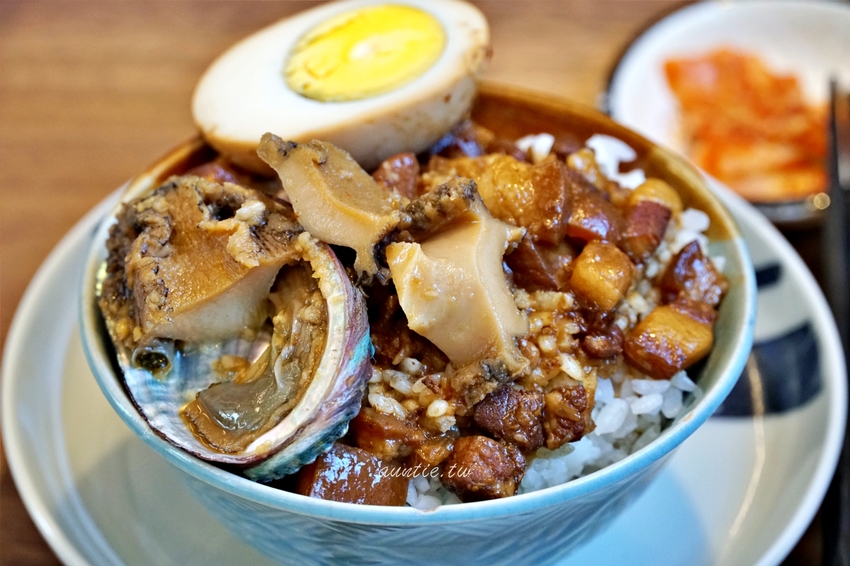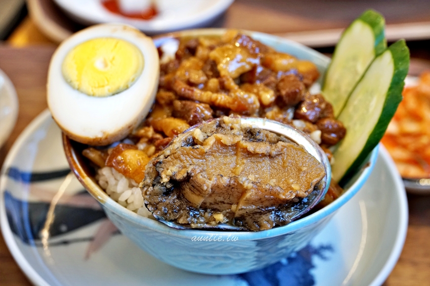 看起來很ㄏㄧ 嘩的滷肉飯,配菜有漬蘿蔔與韓式泡菜以及海帶湯,主角鮑魚滷肉飯油油亮亮看起來真的很吸引人。鮑魚的口感真的很棒,鹹度剛剛好,很新鮮,口感嫩軟嫩,滷肉飯的滷肉切得很大,菜單上還主打手切滷肉,調味是鹹香夠味,不會過鹹太油膩,不過白飯部分偏硬,要是能夠煮得更透一點會更好。