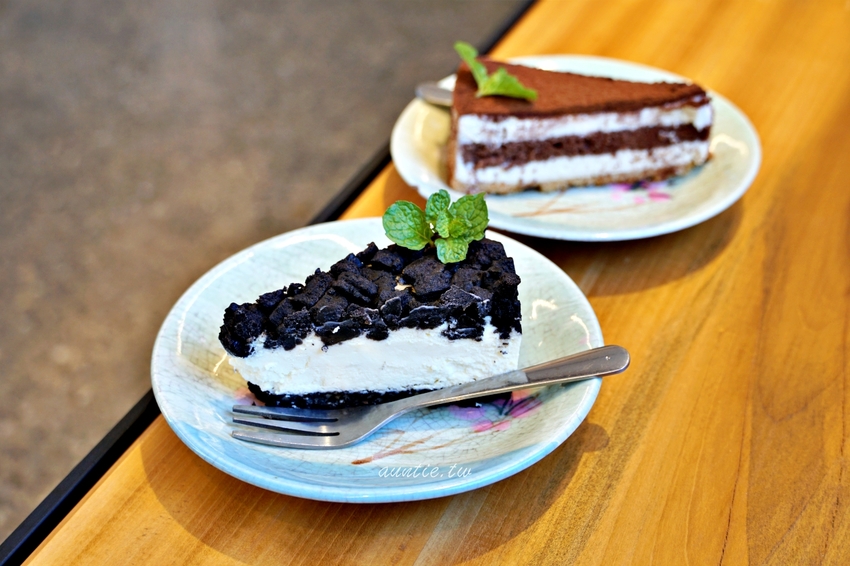 兩款蛋糕甜度不會太高,提拉米蘇口感細膩,底部脆脆餅乾部分很香濃;黑岩優格乳酪帶著一點點優格的酸味,上頭是巧克力餅乾,吃起來像是輕乳酪巧克力蛋糕,兩種甜點味道都很不錯!
