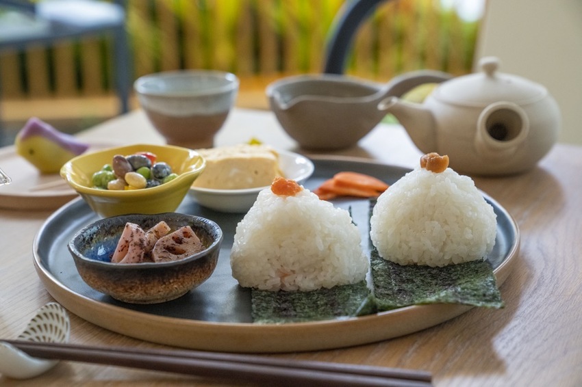 選用進口日本米,製作出手做海苔飯糰,總共有三種口味可以選,分別是明太子、鮭魚、梅子,套餐的飯糰可以選擇量種口味的飯糰。另外套餐中還有附上日式套餐必備的味噌湯、自家製米糠漬物和煎茶。