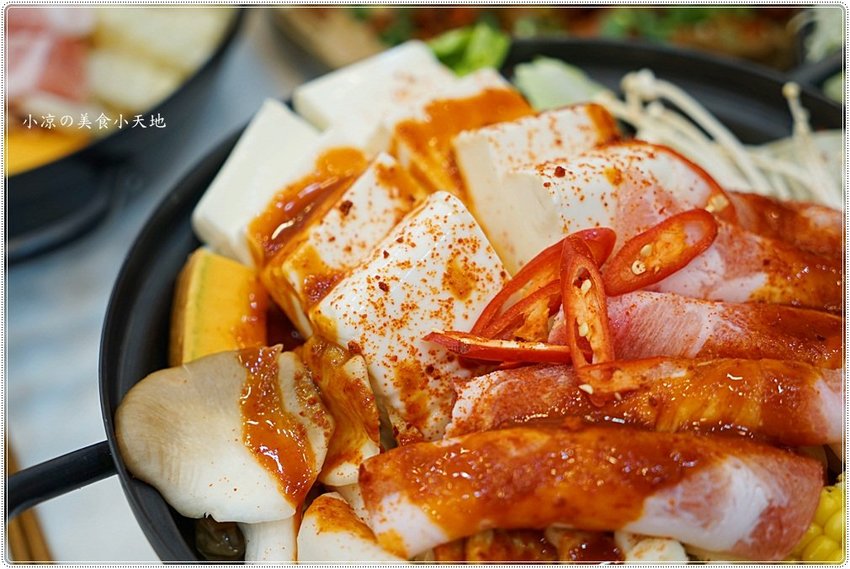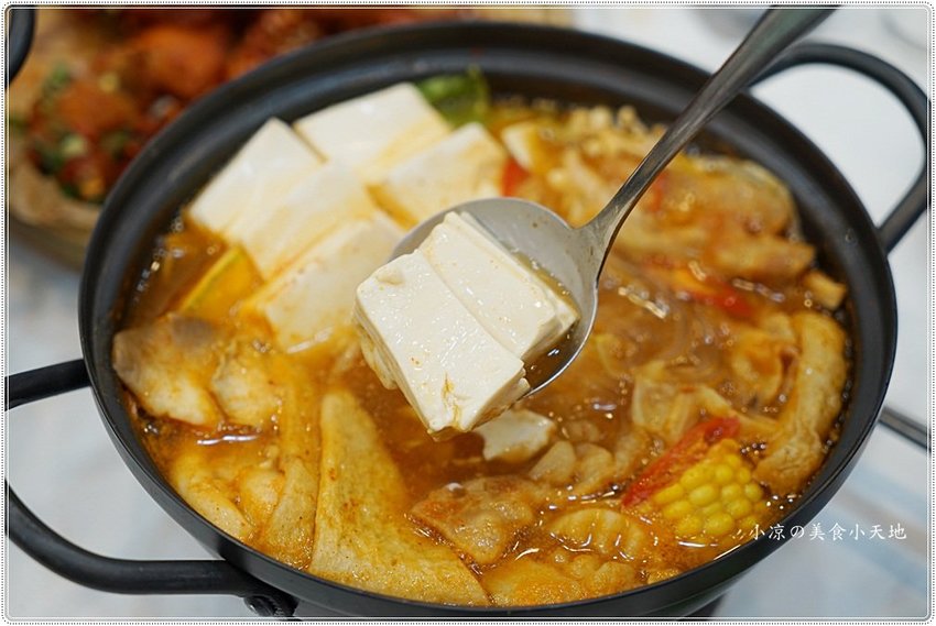 香辣豆腐鍋,鍋物內有大量的嫩豆腐、金針菇、秀珍菇、韓國魚板、韓國甜不辣、韓國年糕條、洋蔥、蘿蔔、豆芽菜、玉米、馬鈴薯、高麗菜、韓國冬粉、南瓜等,並淋上韓國辣醬以及撒上韓國辣椒粉,一整鍋滿滿的配料相當豐富!!