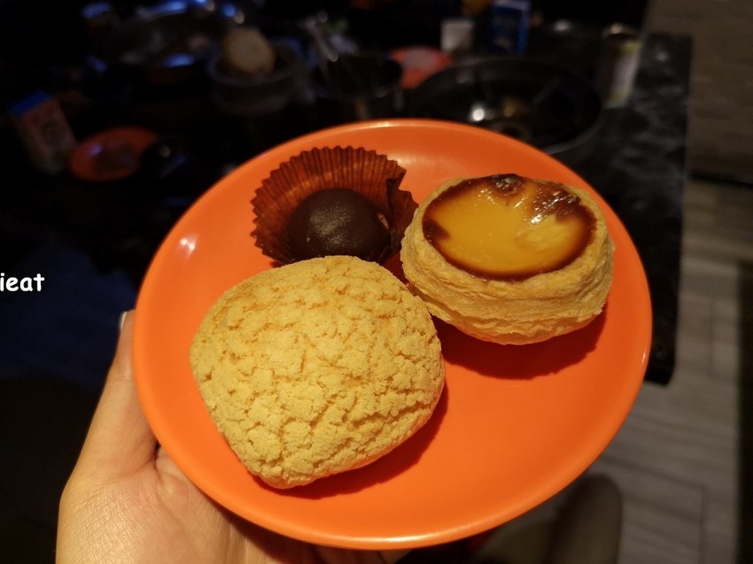 甜點部分我覺得泡芙還不錯吃,蛋塔底皮有點厚,巧克力裏頭包了麻糬,口感有點不合我的胃口。