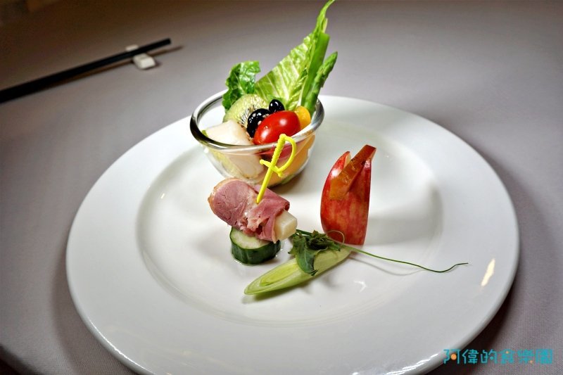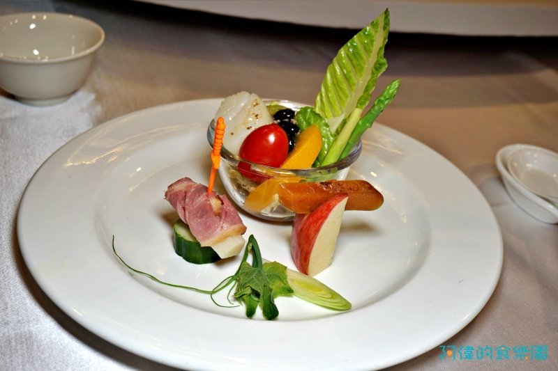 仔細看才知道這一盤裡有很多食材,小玻璃皿中有干貝、黑豆、小番茄、奇異果、美生菜,盤上小黃瓜上插著是用煙燻鴨肉包著的山藥,一旁則是蘋果片及烏魚子。不但色彩繽紛,口感也很豐富,水份含量高,清爽開胃。