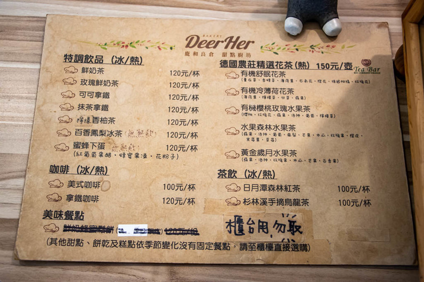 店內的後頭也設有廁所,而午後1點半造訪的我們,也慶幸來得到,店內約莫2點半就已接近全滿狀態….而DeerHer甜點廚坊也有用餐規定,像是用餐限時90分鐘,低消100元,每組人數最多四人等…..