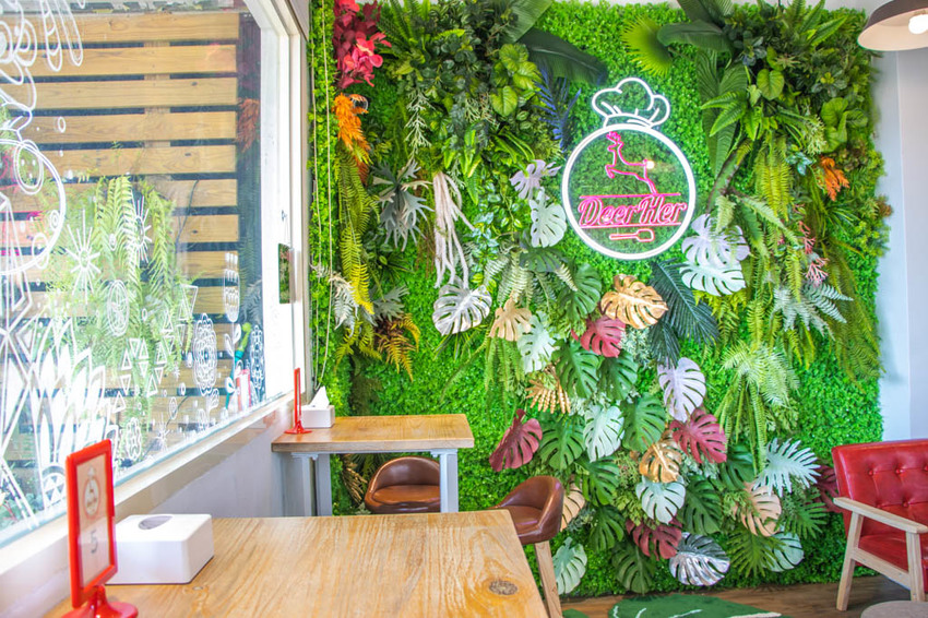 有別於外表那俏皮的卡通風格,入內大量白色牆面有著綠色植栽點綴其中,帶點空靈與清新的風格。