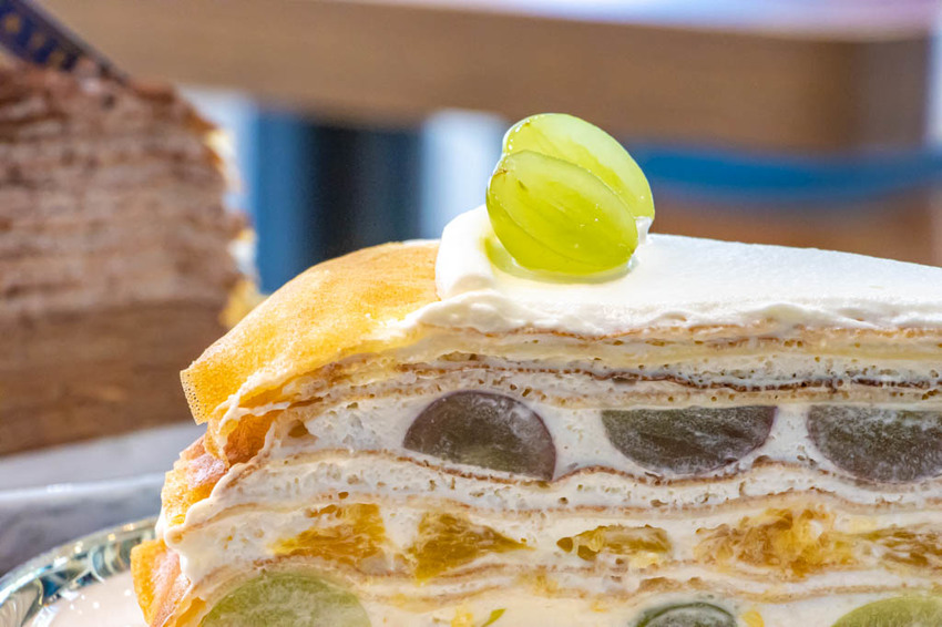 香緹水果千層,奶味滿滿的千層,裡頭有著許多當季水果,看起來很是熱鬧,水果吃起來也很新鮮。