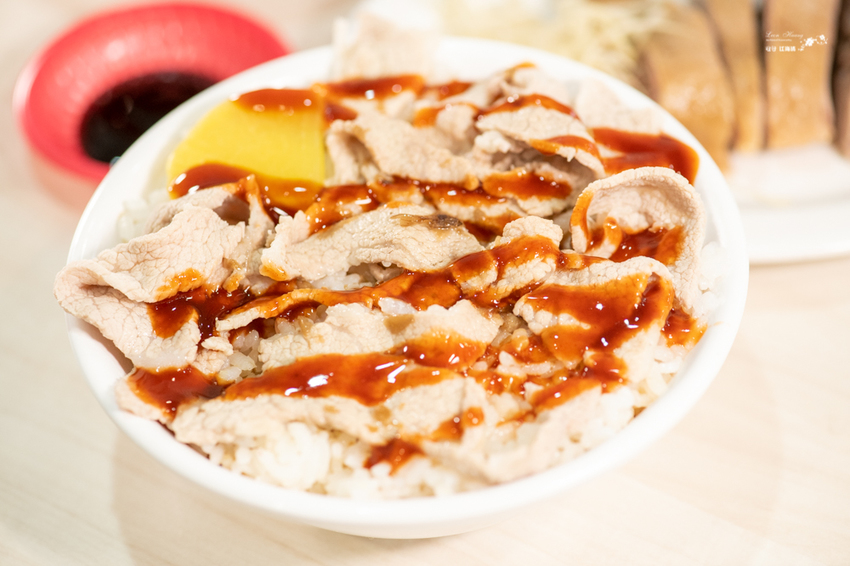 淋上甜辣醬調味的霜降豬肉飯,看起來相當可口。馥郁鮮美的豬肉與濕軟的米飯彼此唱和,在口中豐腴滑口,甜辣醬增添了豐饒滋味,卻不會有油膩的感受。