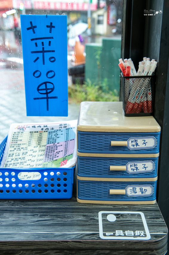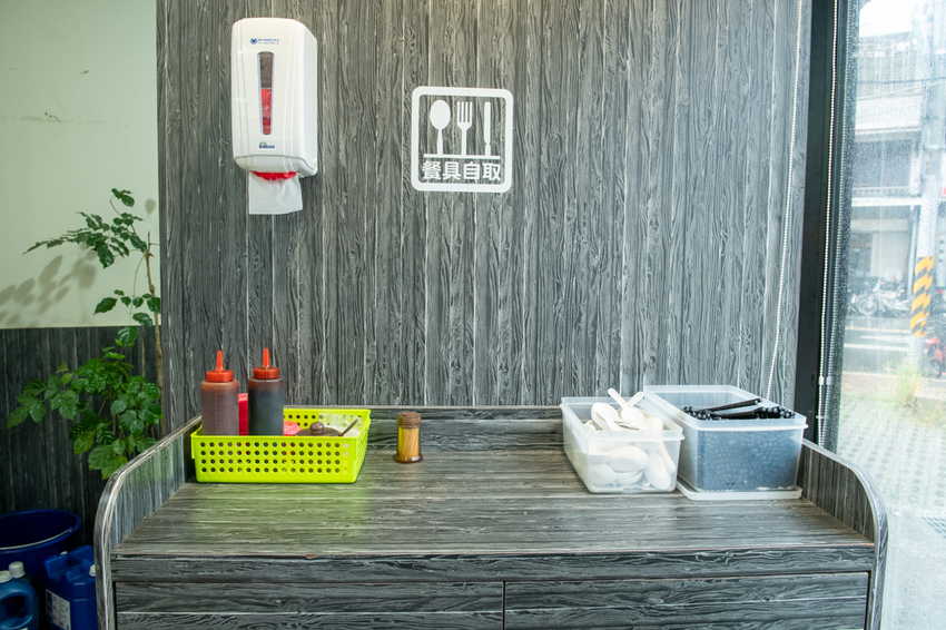店家的菜單放在入口處的右手邊,這樣比較不會跟正在點餐或是等候的客人一起擠在櫃檯前,一旁是免洗餐具的取用處,一般重覆性的餐具與醬料區則位在用餐空間的右邊。