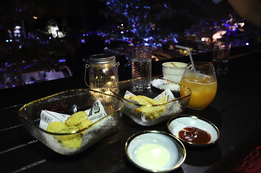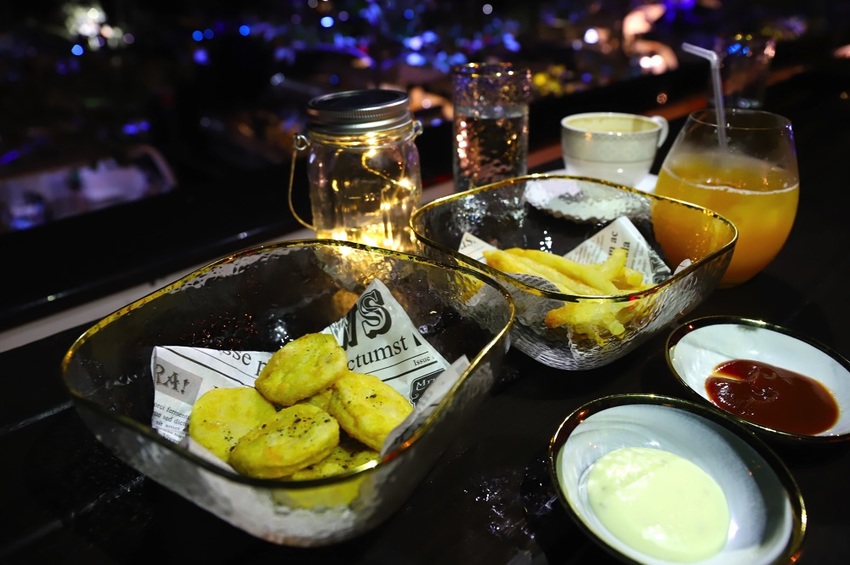我們三個人,間單點了 拿鐵咖啡、果汁調酒、炸物點心~