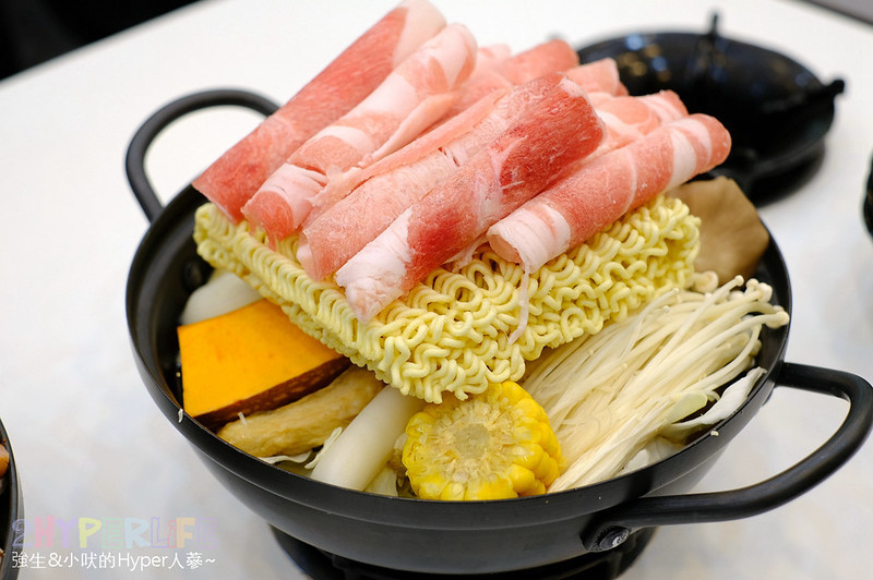上面搭配牛肉還有起司的部隊鍋,其紅色的醬料、泡菜都是來自韓國。滿滿的蔬菜和肉類塞滿了鍋子,你說食量小的話2個人吃這一鍋也不為過啊