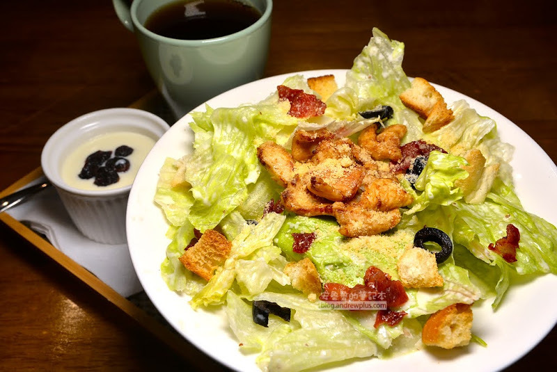首先上桌是新鮮快樂雞肉沙拉,隨餐附上添加蔓越莓乾的低脂優格,以及冷熱紅茶、咖啡、柳丁汁、蘋果汁四選一的飲料,我選了熱咖啡,咖啡味道還不錯