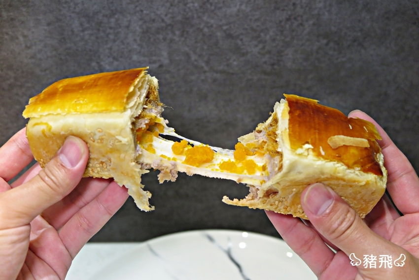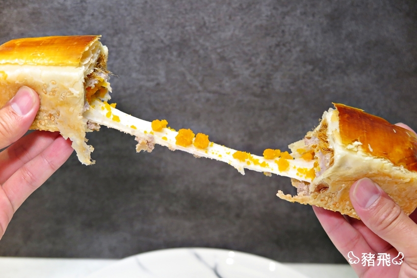 ▲從多層次外皮到內餡滿滿爆料芋泥、飽滿鹹蛋黃、傳統肉鬆、牽絲麻糬,一個小小點心藏有超多餡料,沒想到大餅搖身一變成為時尚下午茶點心了,一口咬下風味十足,嘴裡瞬間充滿了幸福滋味。