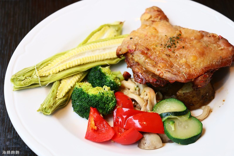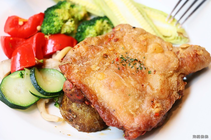 雞腿排外皮煎的酥脆,刀子切下去會卡滋作響