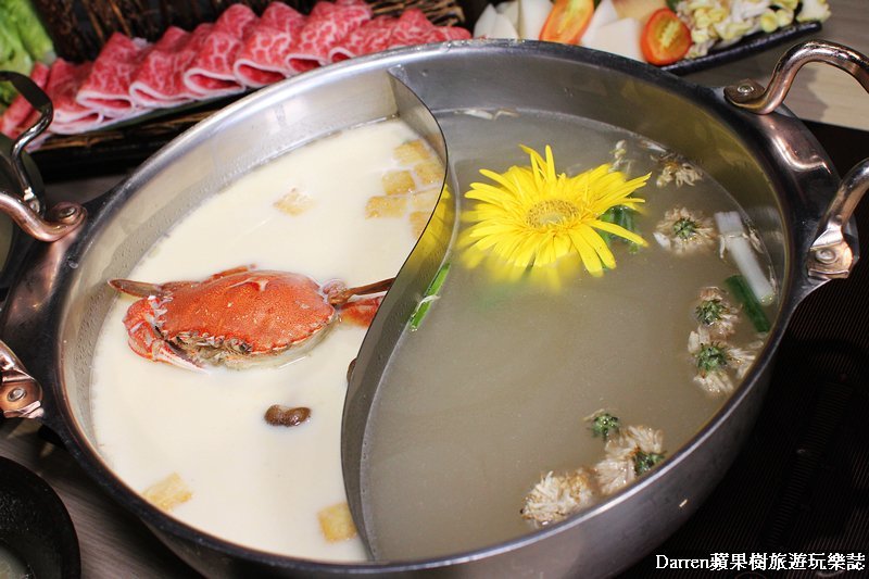 ▲▼耐寒唯有東雛菊&正是蟹黃蔥綠時,鴛鴦火鍋一次吃到兩種創意湯頭,感覺來到東雛菊就一定要試試耐寒唯有東雛菊,使用老母雞、精華火腿、干貝等熬煮的老火湯底,加入龍眼乾、貴妃蜜棗、枸杞提升甘味,最後放入菊花讓湯頭增添菊花清香,店家還會附上一碗膠原魚露,加進湯底多了滿滿膠原蛋白,這湯底樹小編直接來煮海鮮超級MATCH