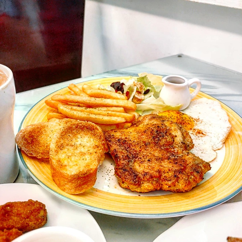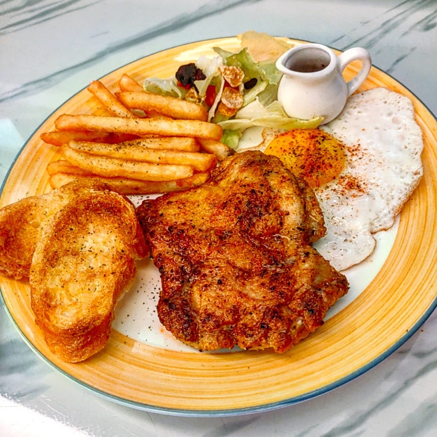 內容物:香料雞腿排,半熟荷包蛋,薯條🍟,沙拉🥗,法國🇫🇷麵包。