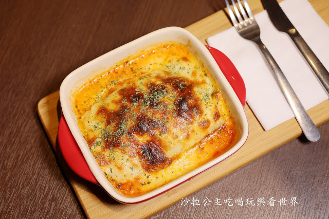 千層麵上的焗烤起司是起司控不可錯過的,千層麵與肉醬層層堆疊著,切開與起司融合在一起,吃起來超涮嘴