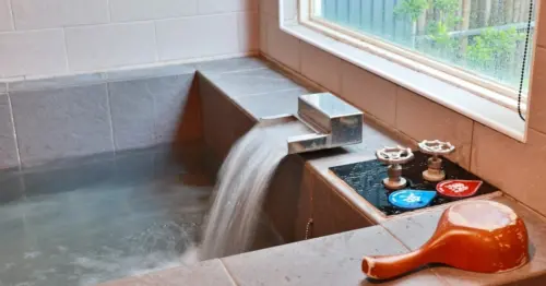 天然溫泉水冒出從地底冒出,從旁邊引進冰涼溪水
