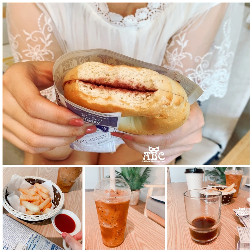 我們點了:藍莓貝果、花生鬆餅、薯條、英式紅茶拿鐵、拿鐵冰沙。
