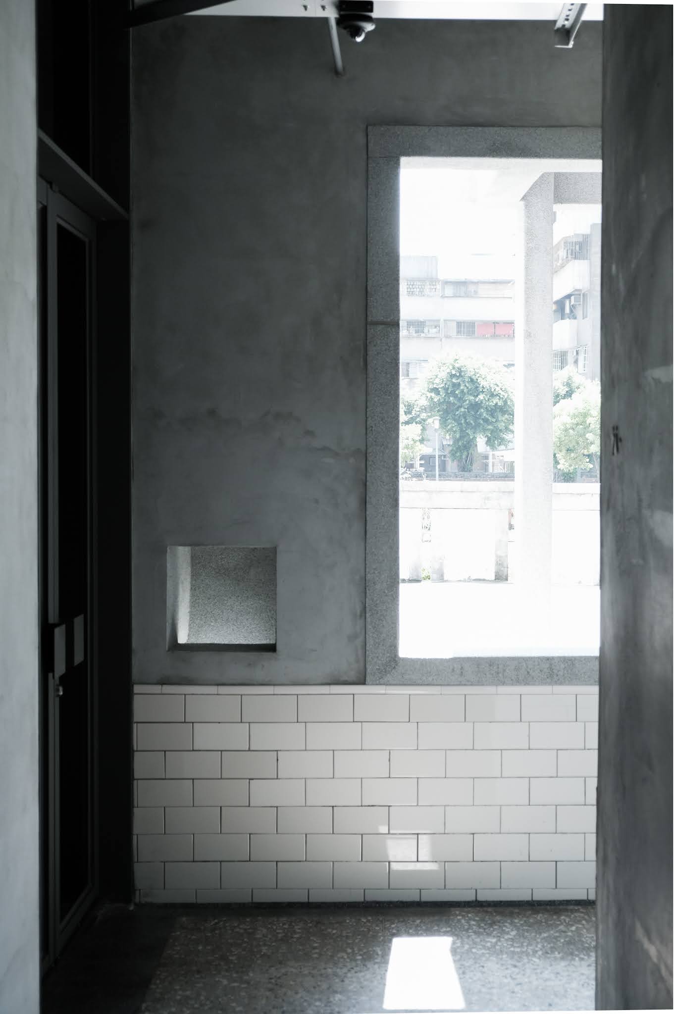 從內向外的視線,以中心木長椅到大面開放的外牆,