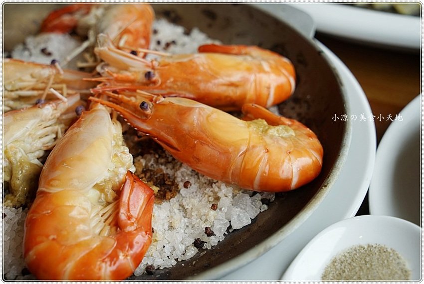 這特級公蝦一上桌有讓我嚇到,真的好大一尾公蝦!! 以海鹽舖底放上公蝦,簡單的料理就是要讓客人吃到蝦子的原始鮮甜味,跟一般的烤蝦裹上滿滿的鹽巴很不一樣作法唷!!