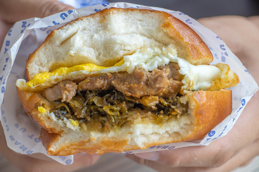 裡頭的配料其實和刈包很像,有酸菜、花生粉(有甜味)、蛋與豬肉 (有滷透少量帶肥),只是外層的麵皮變成了饅頭,而且雖然是炸的,可熱熱吃的時候完全感覺不到油膩。