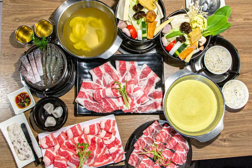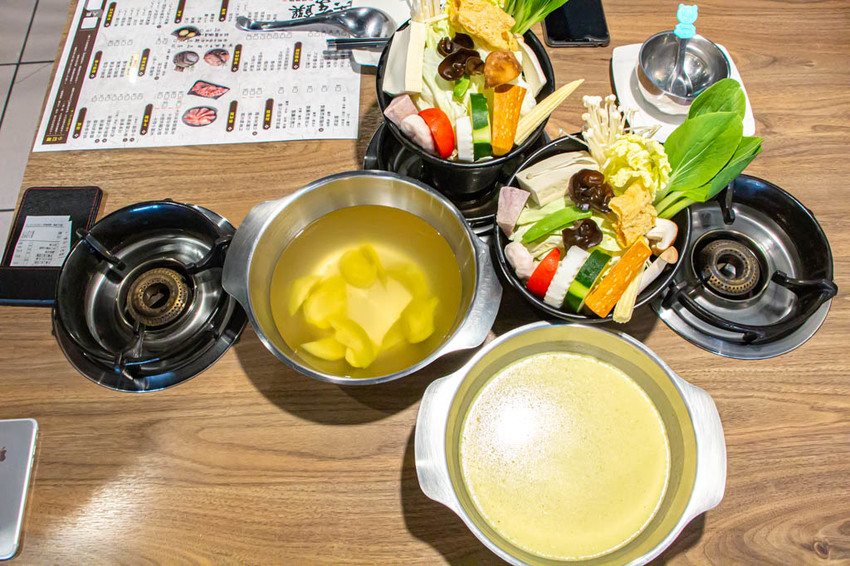 點完餐後沒多久湯頭和菜盤就送上來,店家告知肉品現點現切,需稍等一下,但其實….我才拍完二個湯底就上桌了,比想像中的快很多XD。