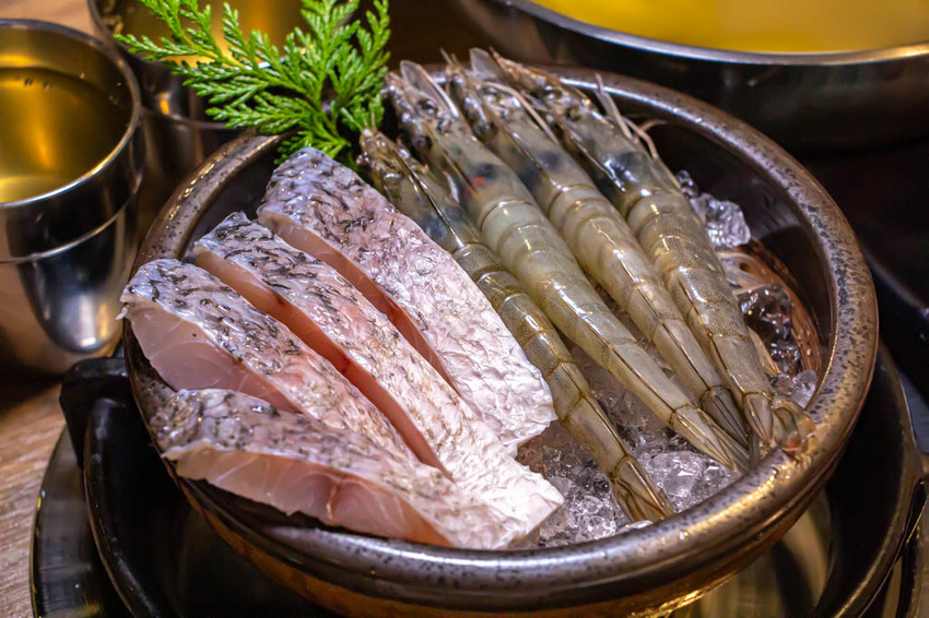 這鱸魚拚盤,我們則是全數都往西瓜棉湯底的鍋裡投,魚片的厚度頗為明顯,大小尚可,藍鑽蝦的個頭倒是很常見的尺寸。
