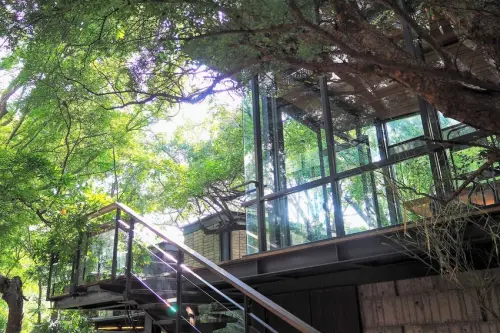 在綠意包圍下的半畝院子,灑落清透的自然光,空間寬敞舒適,相當適合好友聚會聊天。充滿人文藝術感的商品展示區,值得細細參觀。音樂輕柔飄盪、服務和微笑都相當療癒人心。
