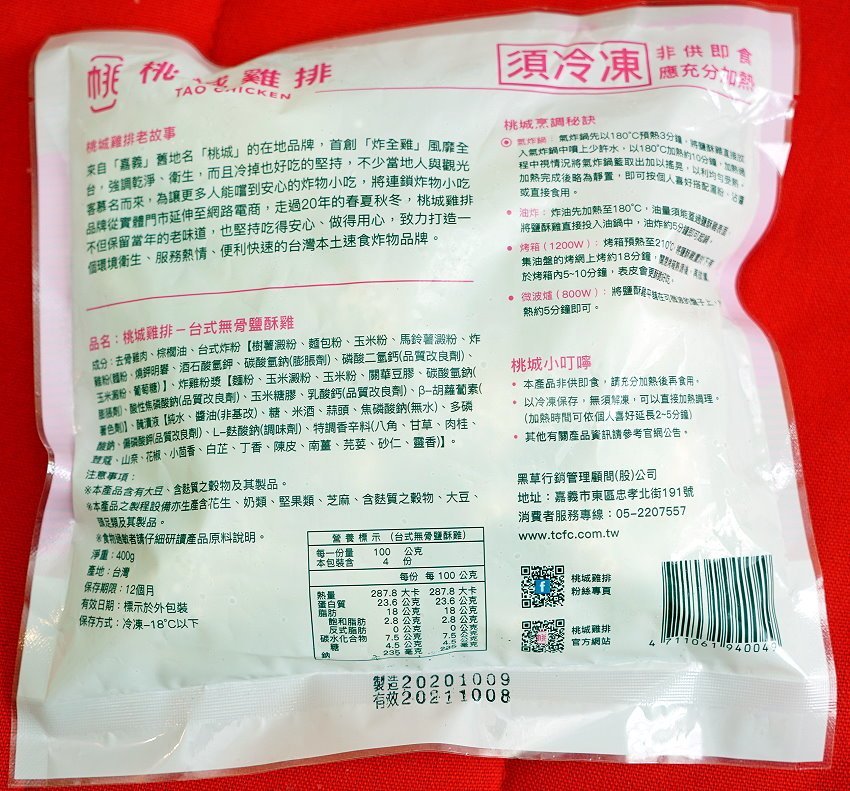 ▼背面也有「桃城雞排」的介紹、品名、成份、營養標示、食用方式、保存日期及店家QR Code,讓大家吃得安心又美味!