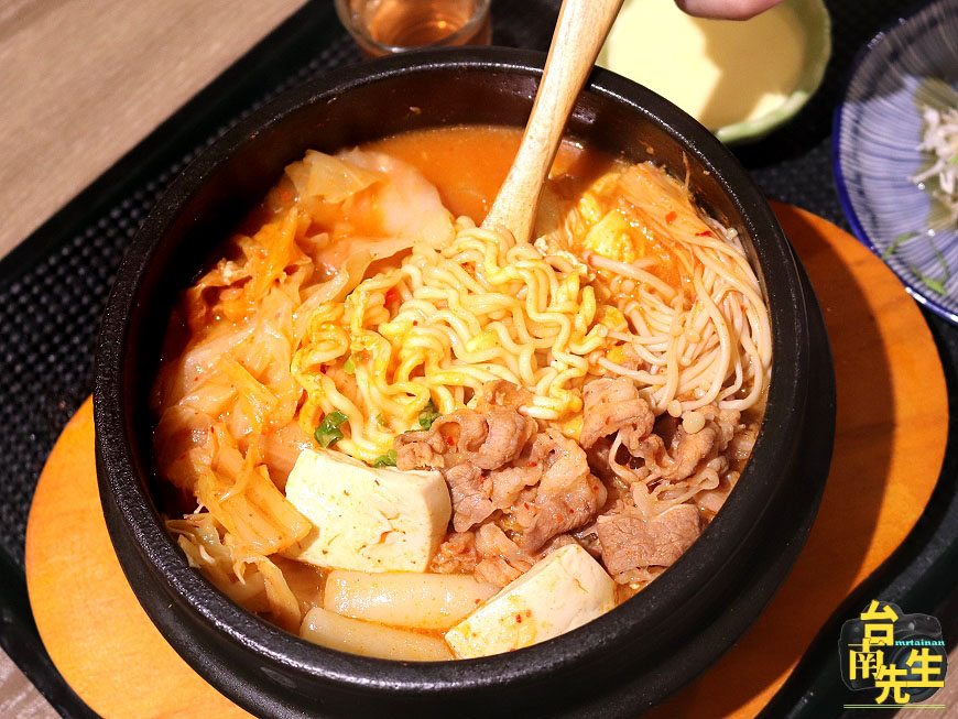 湯頭辣度大約小辣,溫和順口超開胃,即使不吃辣的人也能輕易接受;裡頭食材有豆腐、年糕、豬肉片、韓式泡菜、韓國拉麵等,料多實在超有飽足感