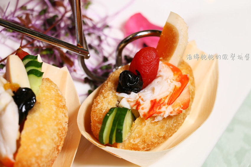 把龍蝦肉夾入酥炸麵包,加上糖心蛋、蜜餞及小黃瓜