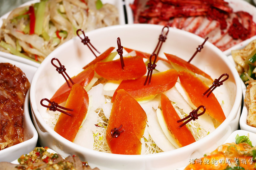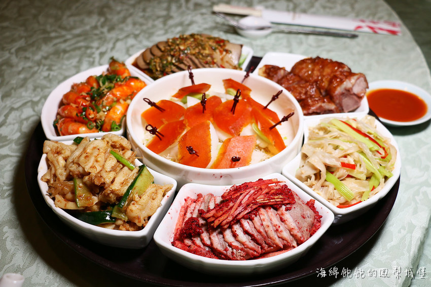 有紅糟鴨肉、鹽酥蝦、沙茶鴨掌、五香粉肝、鹽酥烏魚腱、龍膜炒芹菜、酥炸雞卷