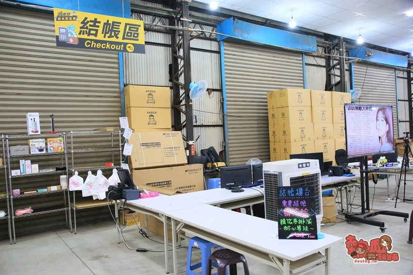 寬敞的倉庫內約莫500坪左右,真的很大!雖然沒有冷氣,但現場也有多台大型電風扇在吹~