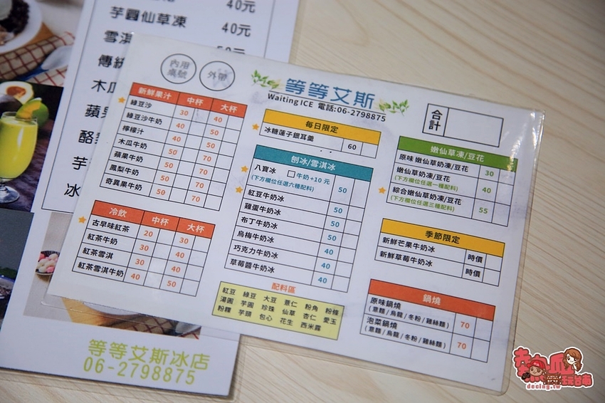 這裡主要以冰品、仙草冰、豆花、果汁飲品、鬆餅為主,另有每日限量冰糖蓮子銀耳羹及季節限定芒果、草莓冰,夏季賣冰品,隨著季節漸涼,也會陸續推出冬季限定熱飲~另搭配冰品、仙草的配料超過15種可挑選,種類上也相當豐富啦,除此之外想來碗鍋燒或咖哩這裡也能一次滿足。