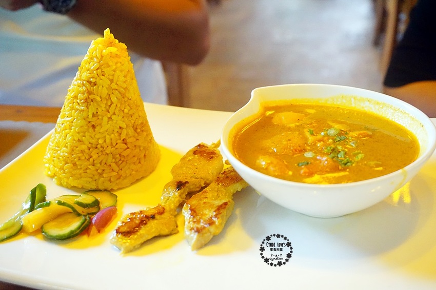 峇里島天然香料套餐 $390,黃咖啡搭配黃薑飯,再配上豬肉沙嗲,使用自家種植的東南亞香料,13種天然香料料理醃製而成豬肉沙嗲,肉質鮮嫩外,辛香味十足,超濃的黃咖哩搭上薑黃飯,非常夠味,也是道很好下飯的料理。