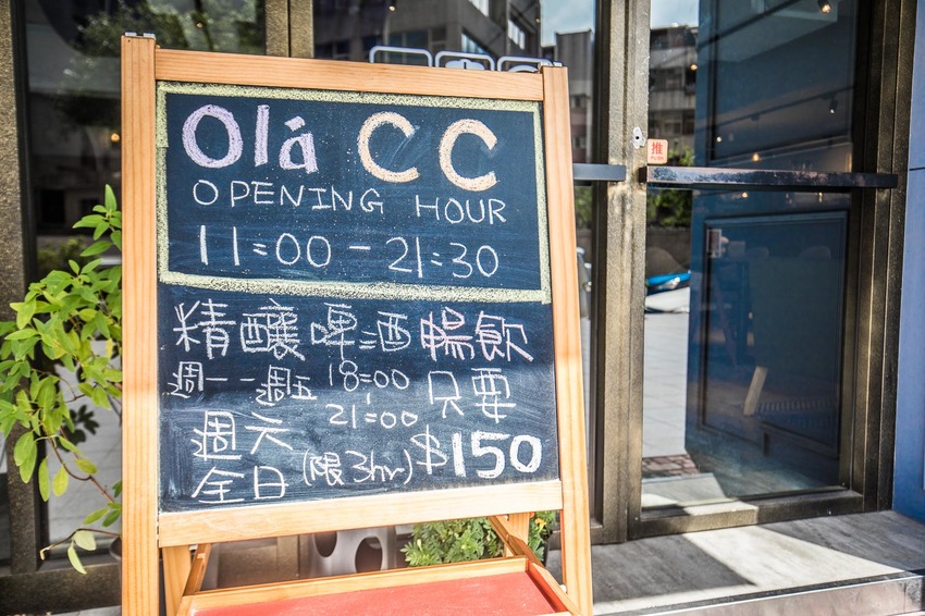 Olá C.C. Cafe & Eatery的店面設計很有歐式風格,淺藍色的門面,加上黑色的大面桌地窗,很有歐洲街邊小餐酒館的風格,門前的小黑板寫著精釀啤酒暢飲的優惠時間,精釀啤酒一般光單點至少就要200元之譜,這邊凡點餐滿低消300元,就能以150元加購啤酒暢飲,真的狂!