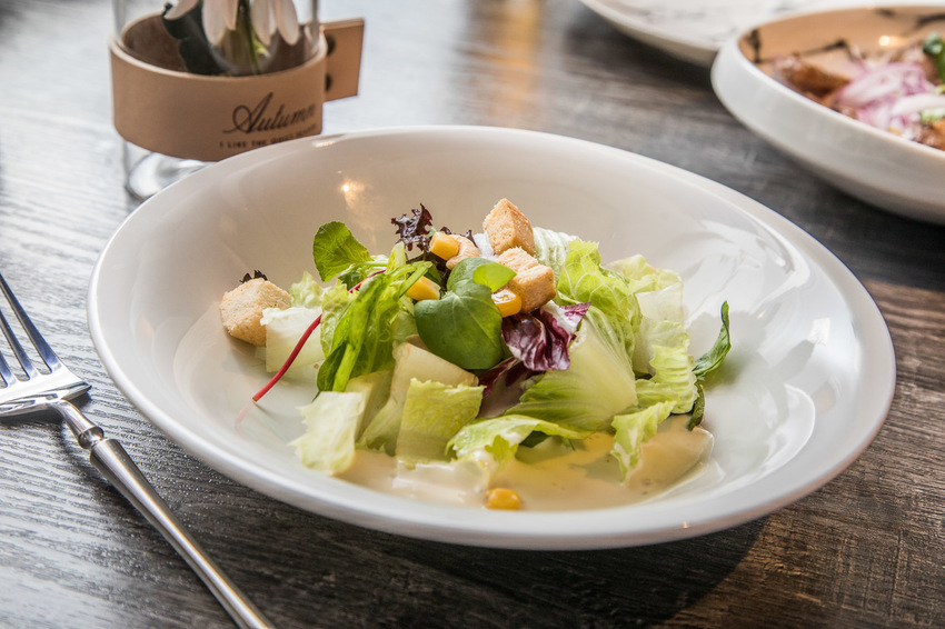 點主餐的凱薩沙拉,凱薩沙拉份量相當有誠意,生菜口感爽脆搭配特製的凱薩醬,上面撒上脆脆麵包丁超加分