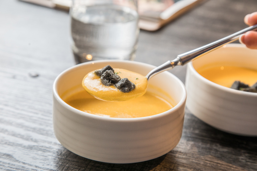 我們點了三份主餐及搭配一些下酒的點心小食,點主餐都有附今日例湯、茶、今日甜點,今天的例湯是南瓜濃湯,南瓜濃湯喝起來很是甘甜順口!還喝的到南瓜泥的口感,濃稠度也相當適宜