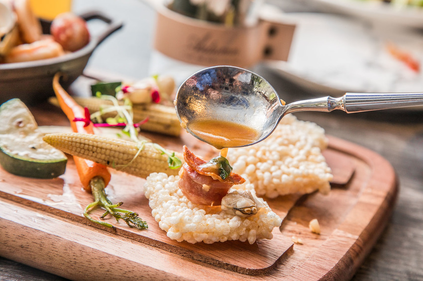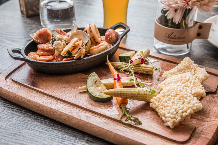 還有一吃就是將濃醇醬汁搭著酥脆香鍋巴一起吃,趁熱享用!鍋巴稍稍浸潤了醬汁還保留些微的脆度口感,鹹鮮滲入脆米粒的縫隙中,米香混著海鮮及香腸香氣,口感有趣且豐富