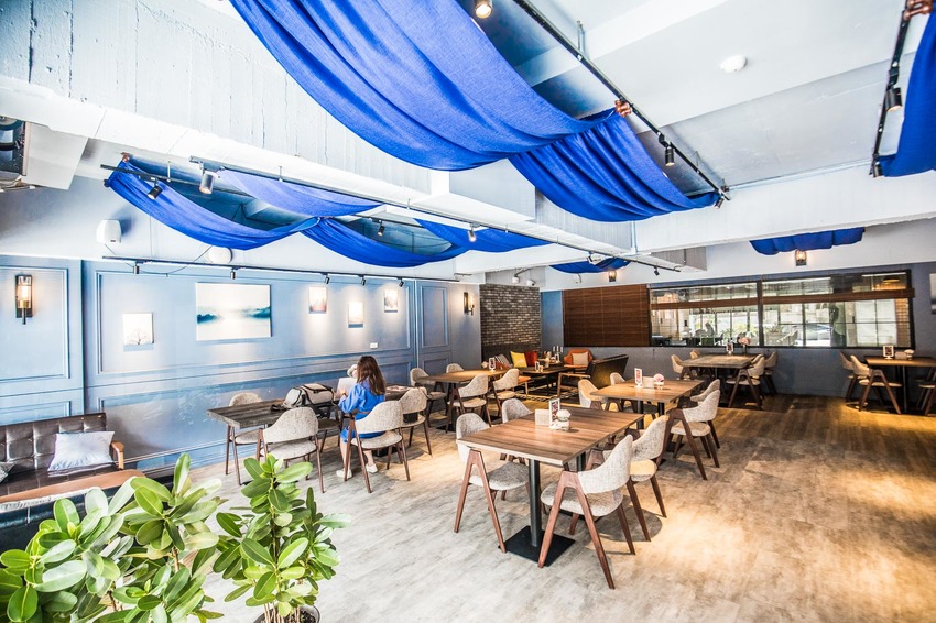 Olá C.C. Cafe & Eatery用餐環境也是相當舒適明亮,不像一般餐酒館那樣給人沈重的暗色調感覺,走海島度假風的藍白風格,用餐區域分為幾個區域,像是靠窗的浪漫沙發區,多人的長桌區,猶如居家客廳空間的大沙發區,幾乎可以滿足所有人的用餐需求
