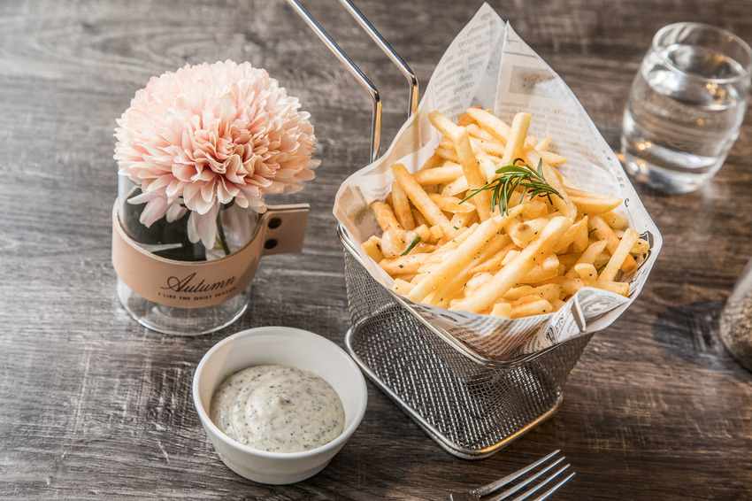 Olá C.C. Cafe & Eatery是選用比較細的薯條,運用油封的技法讓蒜香與香料氣味附著在薯條上,光吃薯條就很有味道,如果再沾上特製的松露美乃滋,松露香氣濃郁,圓潤細緻的口感讓薯條吃起來更加分