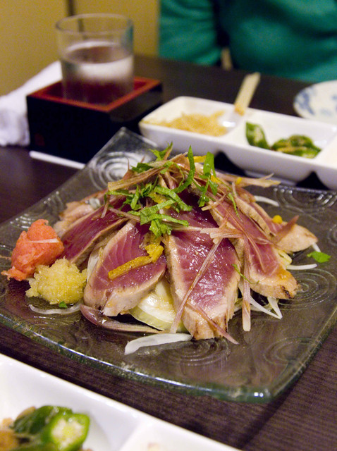 喝酒麻痺一下自已... - 哦,這是吞兵衛的杯墊,底下那句的意思類似"是的,我很樂意" - 鰹のタタキ-基本上將鰹魚四周稍微煎或烤一下切片,中間仍為生的狀態配上洋蔥及日式柑橘類醬油的料理,