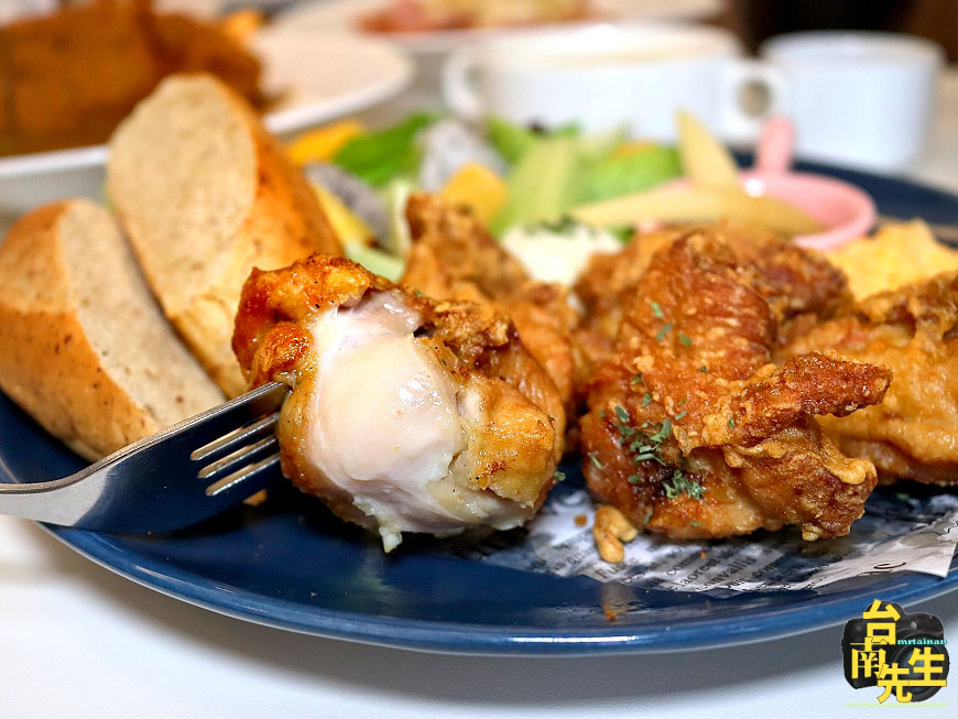 日式唐揚雞(菜多):不想吃薯條的人可以免費換成新鮮水果生菜沙拉,蔬果都是老闆親自上市場挑選採買,淋上自製油醋醬清爽又開胃,搭配特別跟烘焙坊訂作的全麥麵包、馬鈴薯泥、炒蛋,營養均衡又有飽足感