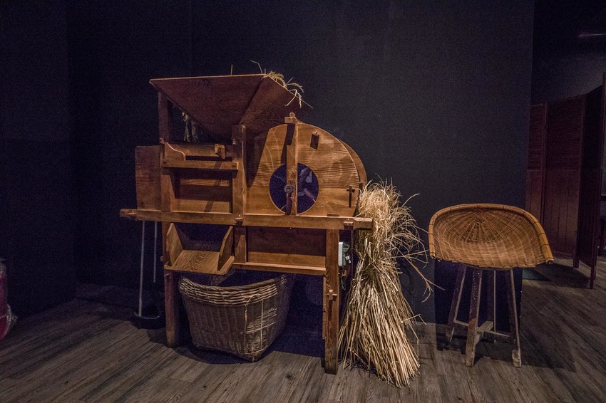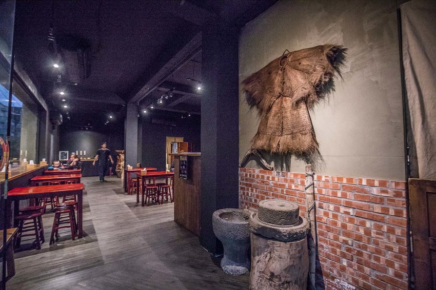 走進辛梅-阿嫲的味道,用餐環境同樣承襲著復古懷舊的風格,牆上掛著蓑衣斗笠,店內還有古董打穀機,以黑色為主色調,加上紅色的窗框及桌椅,時尚與懷舊的巧妙融合