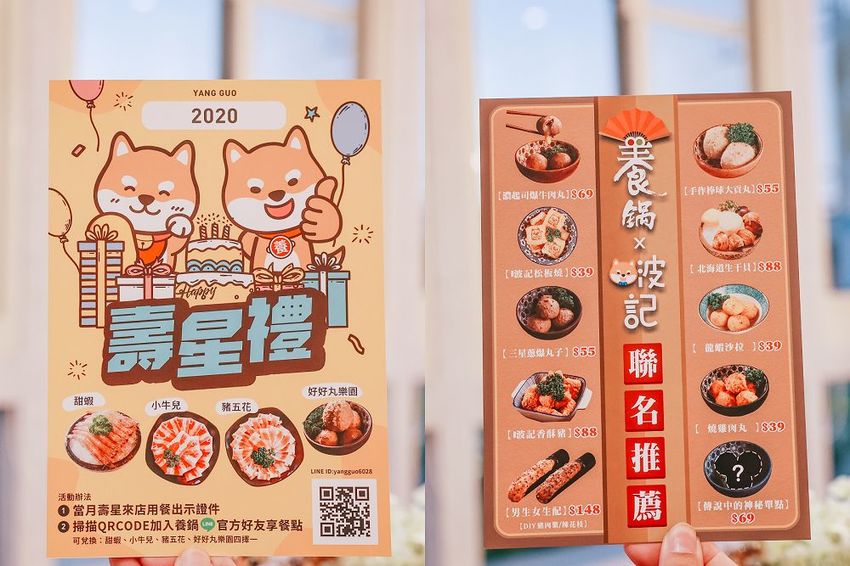養鍋波記聯名推薦單點系列,有9種必推單點,其中男生女生配的漿系列也很夯,以及超神祕傳說中神秘單點,光是看到神秘單點,馬上直接各來一份,另外2020推出壽星禮,凡是當月壽星來店用餐,出示證件,就有甜蝦、小牛兒、豬五花、好好丸樂園可選唷!