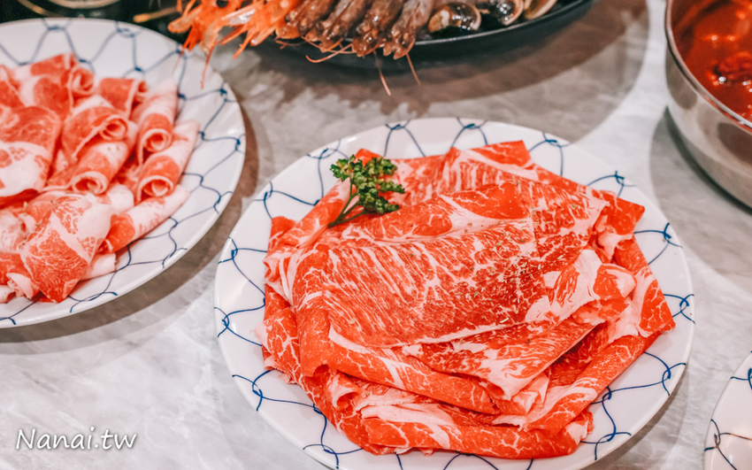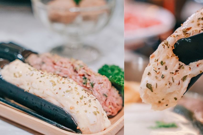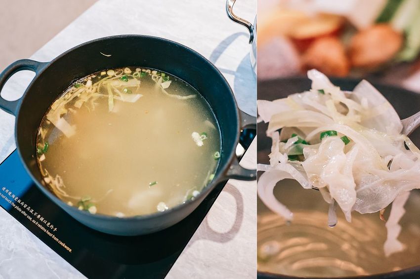 火鍋湯底基本上會附經典石鍋或養鍋,若想來點不一樣也可以選擇加購換湯底,nana選擇了山藥牛奶湯底,除了奶香外,湯底裡有加起片,開煮前記得先緩緩攪拌,避免起司黏在鍋底,勺起湯底入口,喝起來沒有濃郁山藥味,帶有淡淡起司鹹香,奶味濃醇順口,搭配肉品也很契合!