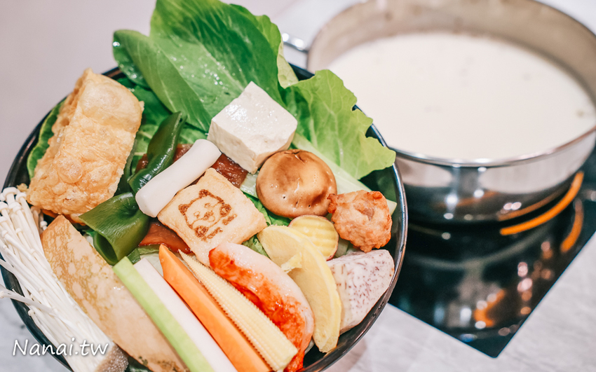 菜盤份量十足,有高麗菜、綠色蔬菜、香菇、豆腐、金針朱、木耳、海帶、芋頭、年糕...等,大約有19樣蔬菜,火鍋料並不多,只有少少幾樣,另外菜盤裡面也有兩個亮點,有啵記松板燒、燒雞肉丸都是熱門暢銷款,說真的菜盤真的很加分,愛吃菜的我,看到滿滿菜盤心已被擄獲!