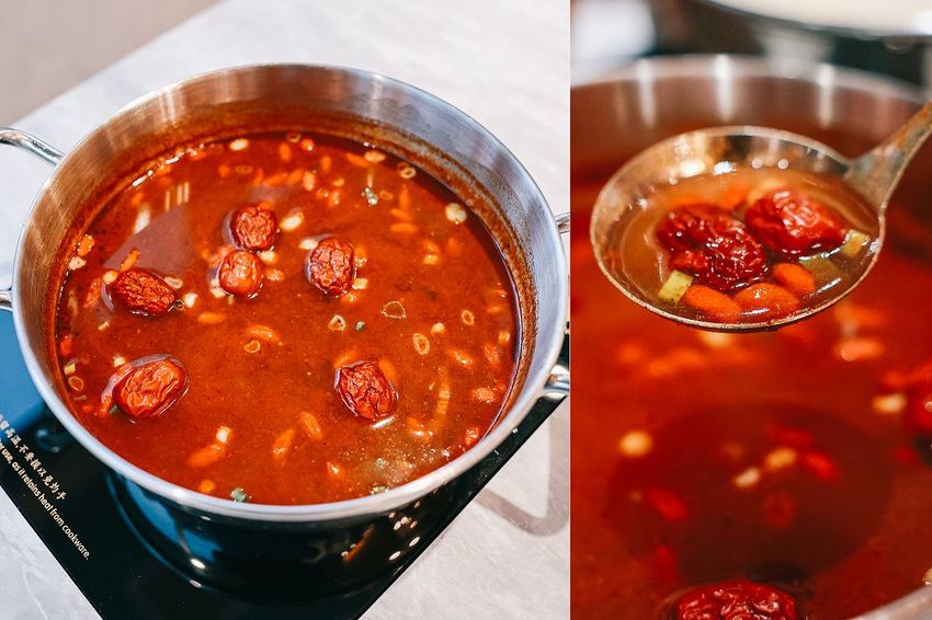 青花麻辣湯底是養鍋熱門款,特別是選用藥膳食材搭配獨家自炒香料,入喉時有微微的麻香味,口味帶些許中藥甘甜味,喝起來不嗆辣,整體上順口又好入喉!