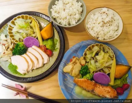 每一份健康餐盒裡約有6~10種菜色,當天遇到菜色有地瓜泥、高麗菜、紅蘿蔔、海帶芽、豆芽菜、四季豆、番茄、芭樂、小黃瓜..等,而他的蔬菜都是用昆布高湯川燙蔬菜,口味上比較清淡,若是有不喜歡菜色,都可以事先告知店家,請店家幫你更換唷!