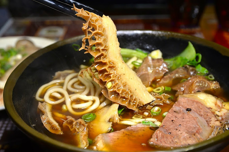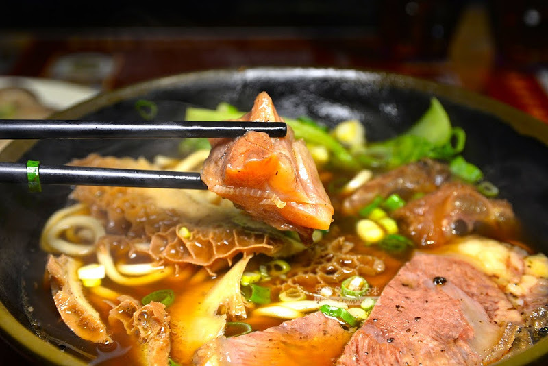 一碗就能吃到牛筋、牛肚和牛肉,紅燒的湯頭散發著香氣,點綴綠色的蔥花和蔬菜,看起來特別誘惑