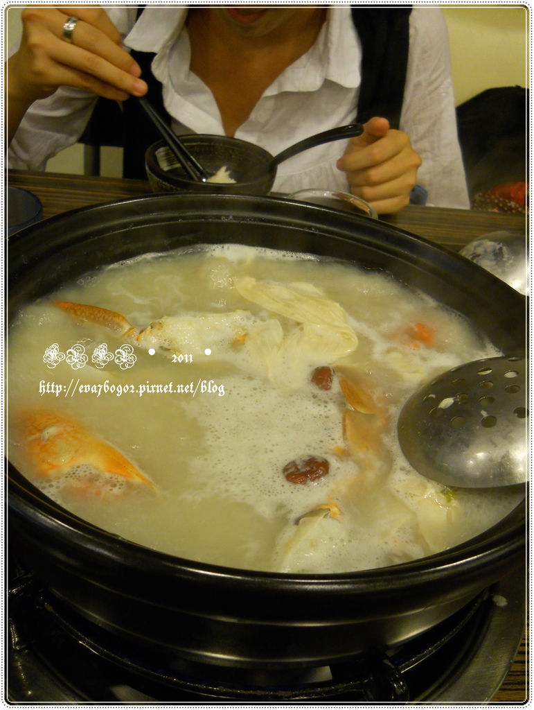 一鍋濃稠稠的湯頭,看的我們口水直流,一開始要先煮螃蟹,後面再接著涮肉,